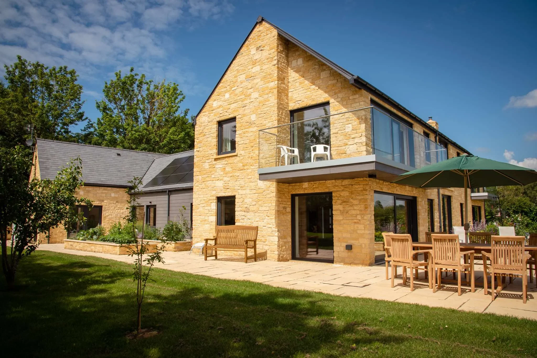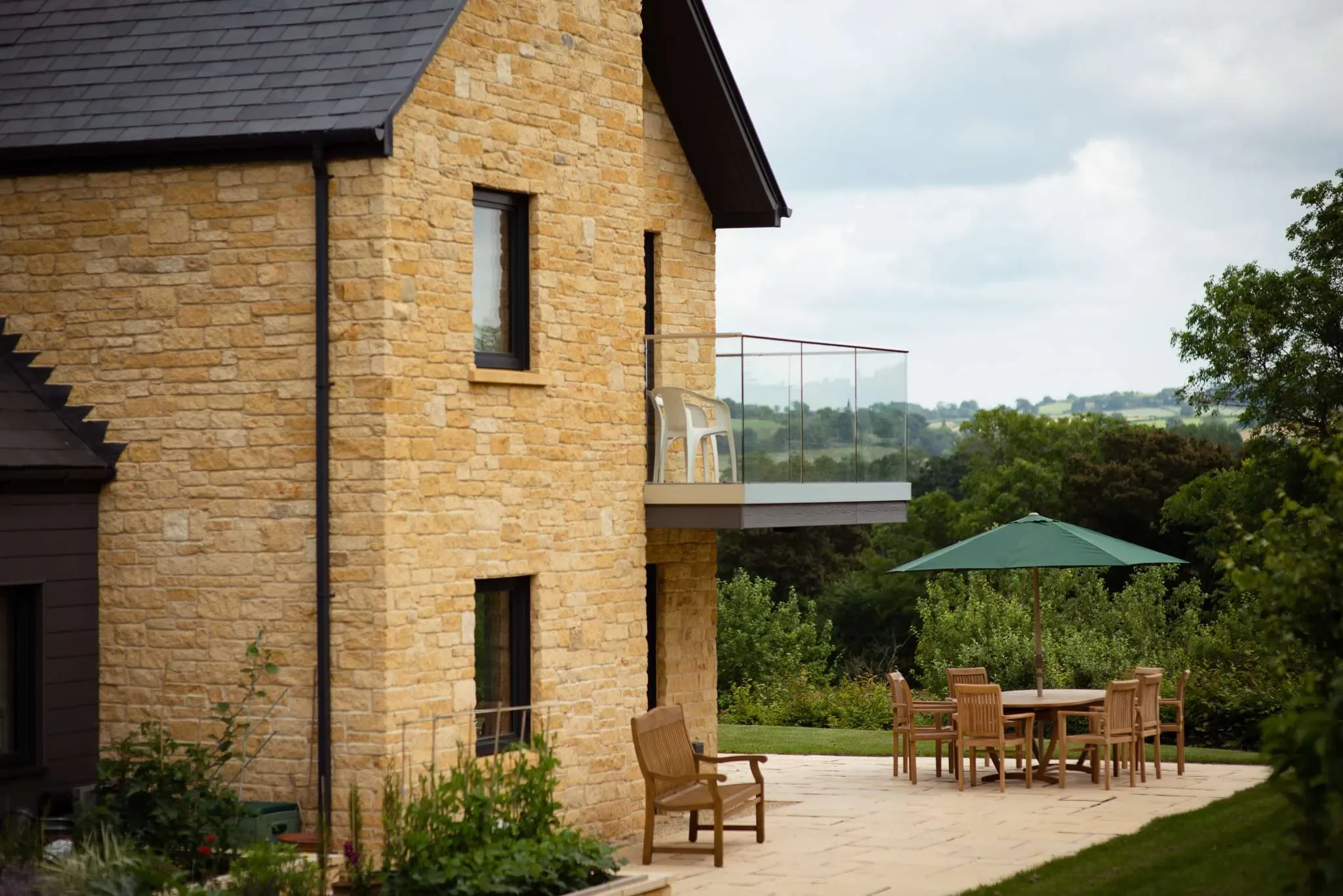 Set in a spectacular location in Warwickshire, it’s the details of this house which makes it so stunning. Designed by Michael Lynons Architecture, the house is timber frame clad in stone, with some fibre cement cladding and a slate roof. It incorporates beautiful features such as a floating, curved staircase, external balconies around the rear elevation, and a vaulted ceiling over the kitchen with a bridge to the bedrooms over the garage.